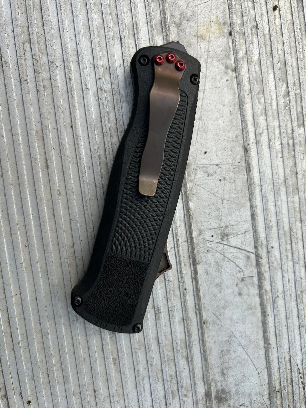Custom hand made titanium pocket clip for Benchmade knives, it's made of 6al-4v titanium. The clip comes with 3 T6 Stainless Torx Screws (Knife is not included).
